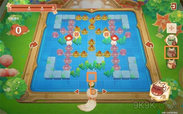4.在橙色格子處投放2號炸彈,注意會動的魚要在炸彈範圍內,建議在魚從最外側往內動兩下的時候開始投放炸彈,獲得2個3號炸彈。
