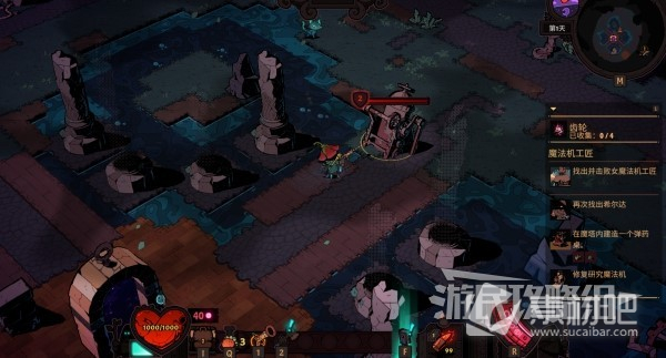 集齊材料後,與通道互動返回魔塔,與研究魔法機互動即可將其修複。