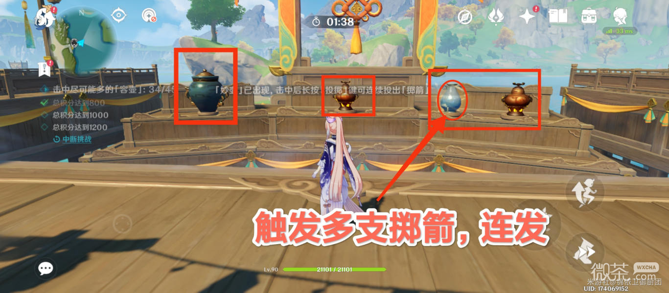 通過擊碎妙壺觸發多支擲箭,長按投擲鍵瞄准吞壺發射擲箭擊中多次後方可擊碎