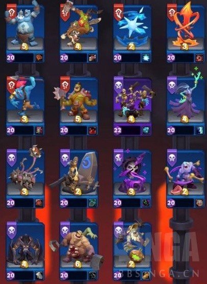 兵種卡牌90金,英雄卡牌120金,普通升級到優秀需要購買3張,優秀到精良需要10張,精良到史詩需要25張,史詩到傳說同樣需要25張。當購買卡片後該兵種可以升級,則卡片上會有箭頭提示(例如圖中E)。