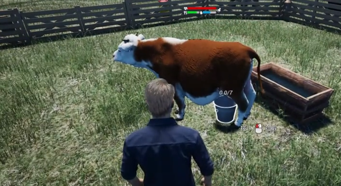 2、擠牛奶的方法:先拿著一個裝牛奶的桶,然後找一個肚子很大的奶牛,按E即可進入擠牛奶界面。