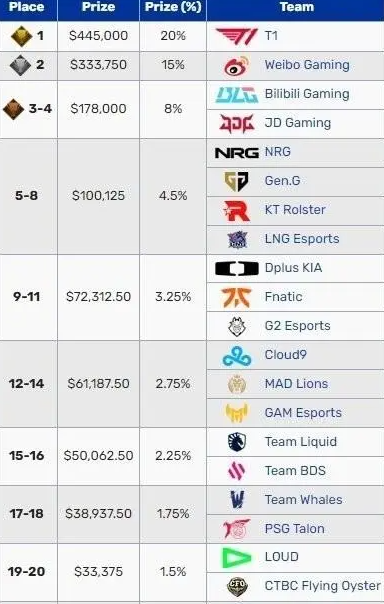 1、最新公布的消息顯示,英雄聯盟(LOL)S13全球總決賽的獎金分配已經確定。總獎池高達2225000美元,各支戰隊將根據成績獲得相應的獎金。讓我們來看一下具體的分配情況。