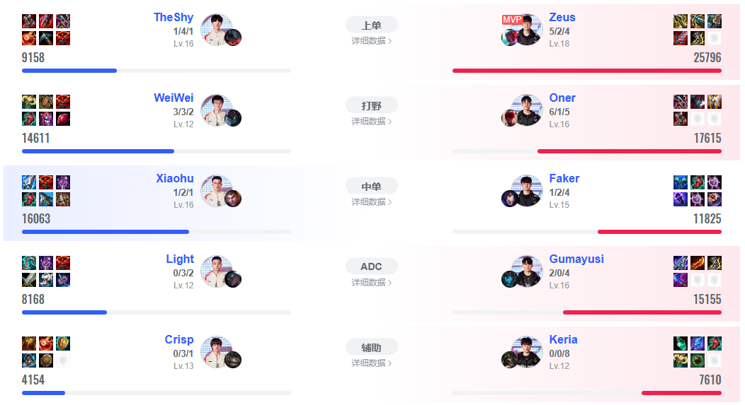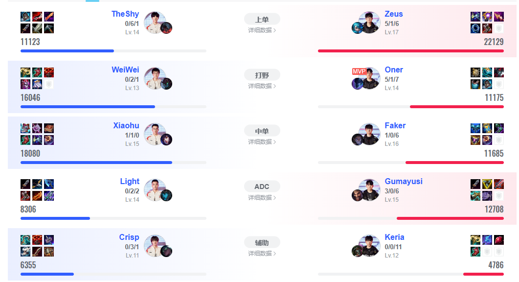 陣容:宙斯:劍魔、oner:盲僧、faker:阿卡麗、gumayusi:霞、keria:洛。