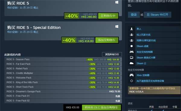 極速騎行5是極速騎行遊戲的系列新作,又是一個激動人心的大作出現,真實模擬的摩托競賽,引擎呼嘯令人熱血沸騰,極速騎行5本體的價格特價是280.8,特別版特價418.8。