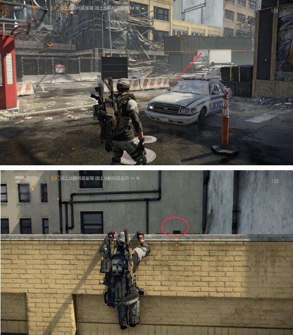 2、看到警車後來到卡車處,爬上黑色集裝箱就可以看到最後一個裝備箱了。