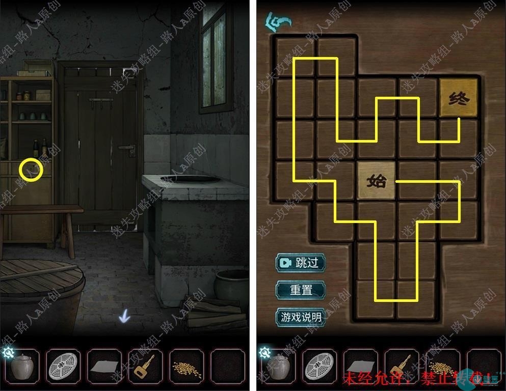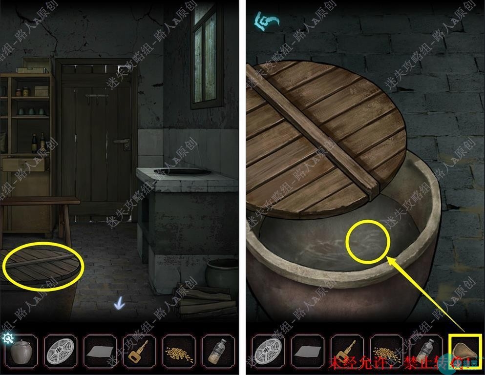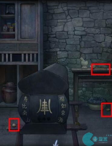 3、拾取【空壇子】、【蒸盤】、【籠布】,將【凳子】放到木櫃下邊,打開木櫃上方的箱子得到【鎖匙】和【脫粒機】。