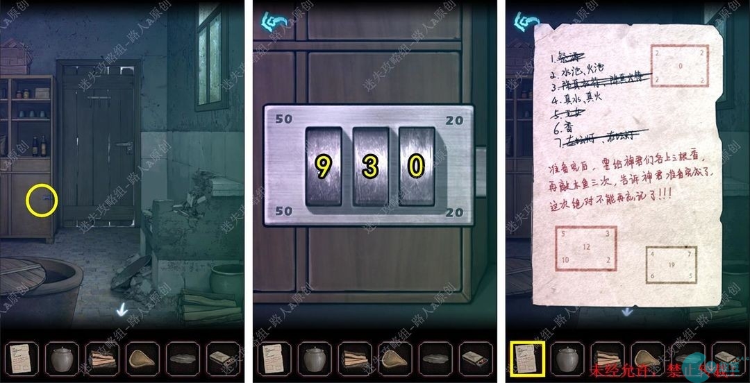 13、依據典禮准備明細的線索(下邊兩數相乘【減掉】上邊兩數相加【等于】中間數據),輸入密碼【930】打開木櫃,得到【甑桶】和【天鍋】。