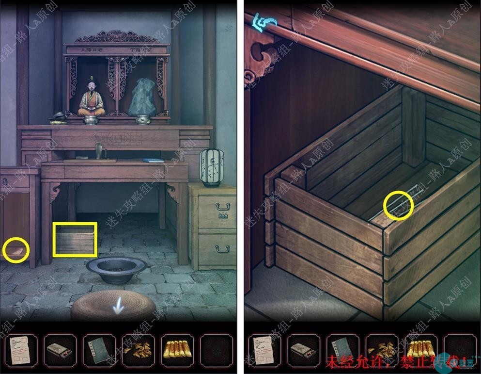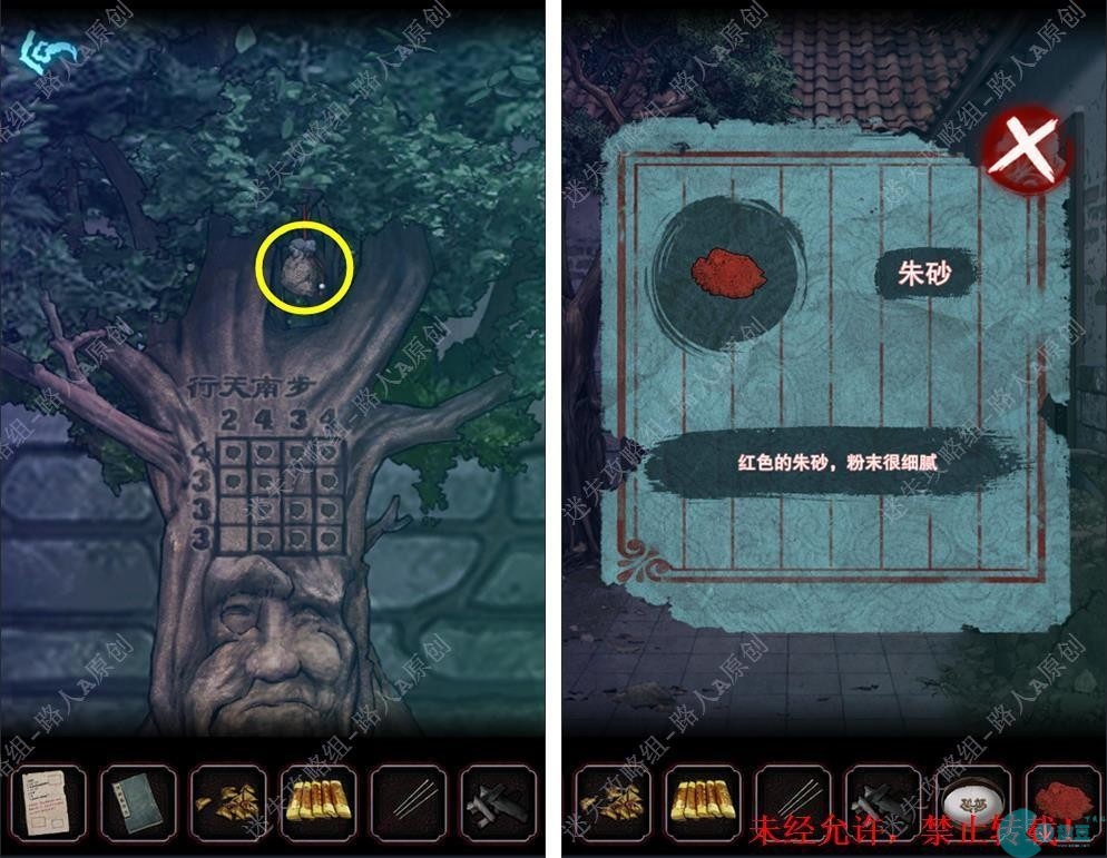 5、使用刮刀可以獲得朱砂,然後根據石頭的線索可以打開機關盒子獲得銅幣。