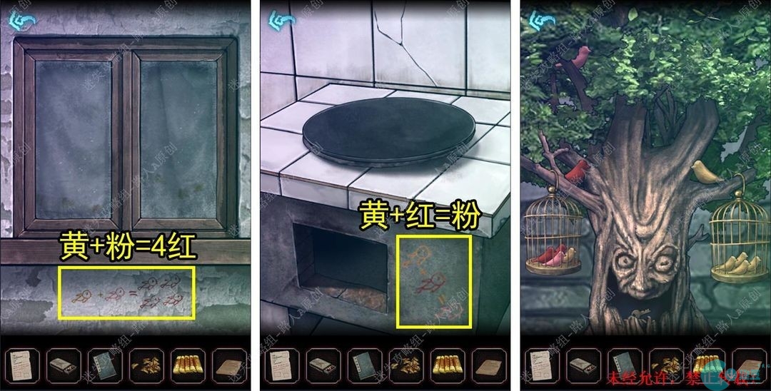 19、依據2處線索,在樹上的右鳥籠放進4只黃鳥(點擊樹上的黃鳥),得到【鎖匙】。