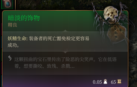 暗淡的飾物 精良。妖精生命:裝備者的死亡豁免檢定更容易成功。《博德之門3》有許多屬性不同的道具武器技能。每個裝備道具都有獨特的數值面板,可以根據裝備道具職業搭配出各種組合,極大提高了遊戲可玩性。