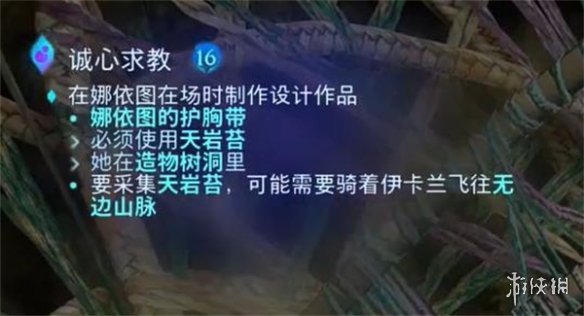18、對話完畢之後,任務變更要求玩家再次制作娜依圖的披巾,只不過這次需要使用天岩苔。