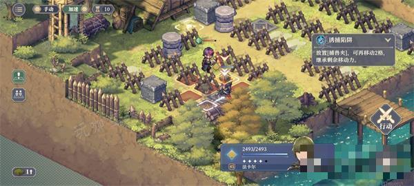 4、第四回合:向左下方移動一格,使用技能[蓄力跳躍]跳過柵欄,使用技能[誘捕陷阱]放置在左上方第二格處,用剩余行動力移動到箭頭標識地面待機獲得一個誘捕陷阱。