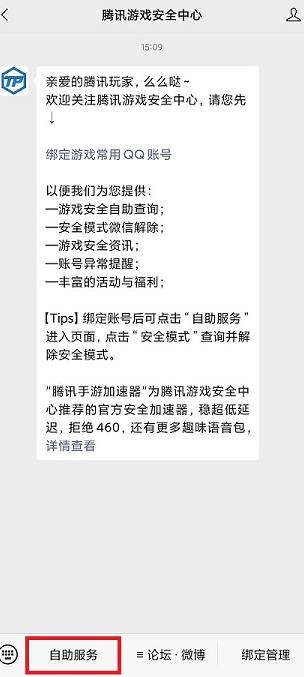 1、微信搜索公衆號:騰訊遊戲安全中心,關注進入頁面,點擊自助服務。
