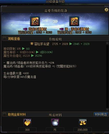 4、最後消耗300金綠、75稀薄迷霧和20萬金幣就可以將裝備升級爲神史詩裝備。