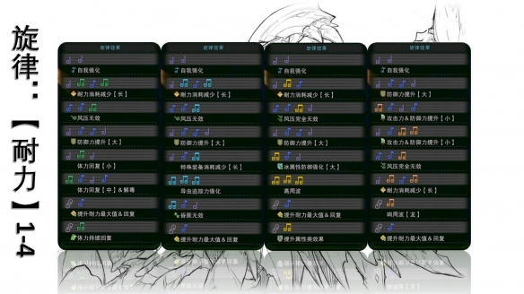 上述這十四種旋律,要麽因爲無法快速演奏,要麽buff本身加成低下,或者部分旋律泛用性低,導致不適合大多數場合,因此使用率較低。