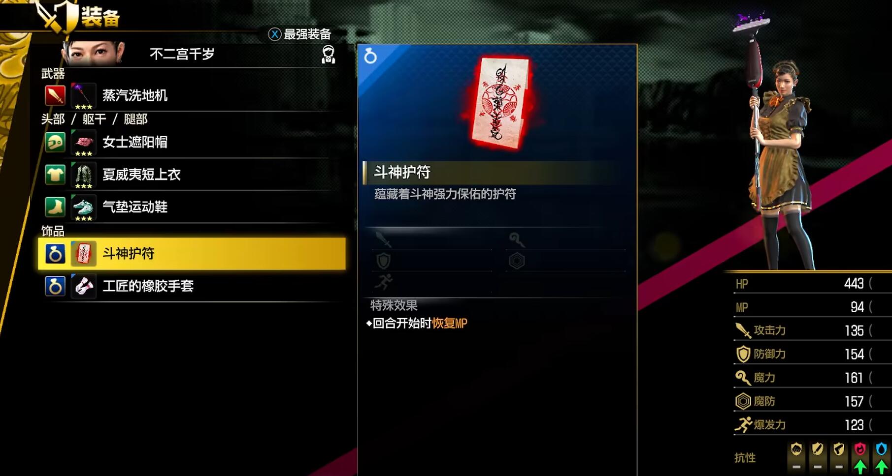 2、然後爲不二宮千歲裝備上鬥神護符。這個裝備可以在回合開始時恢複MP。