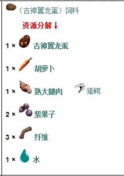 1、首先玩家需先准備霸王龍蛋、玉米、優質熟肉幹、水、120纖維、200紫色漿果等材料;