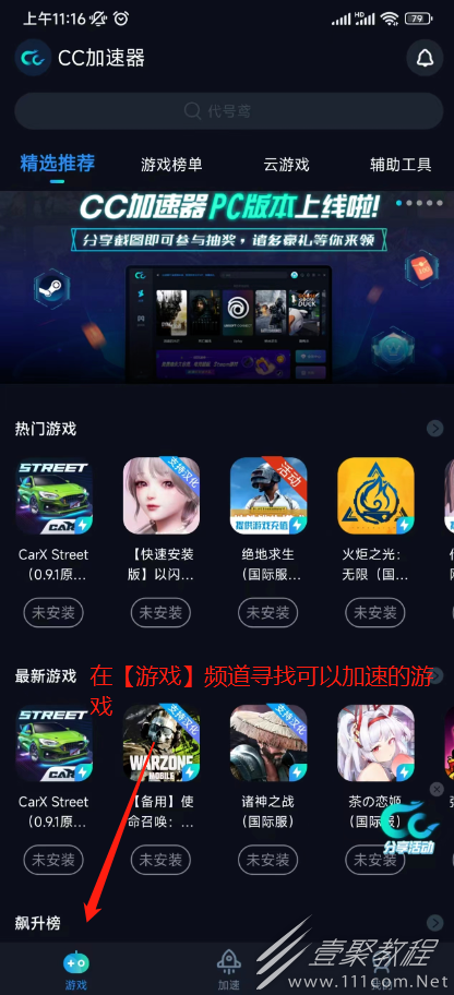 3、在【遊戲頻道】查看可以加速的遊戲,如果不支持那是無法進行加速的;
