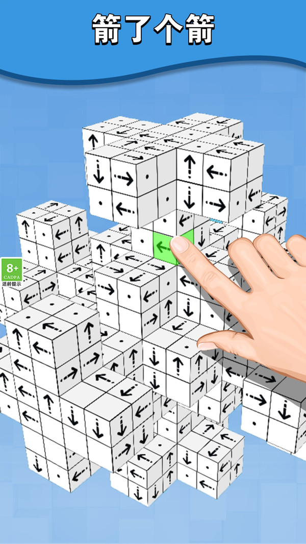 1、玩家需要通過旋轉立方體來觀察不同角度的方塊,並根據屏幕上的箭頭提示點擊相應的方塊進行消除。