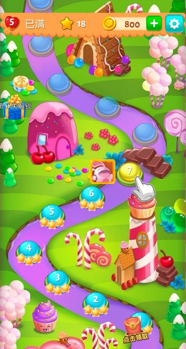 4、過關卡開啓新場景:每個關卡都有不同的場景,在遊戲裏玩家需要通過不斷地消除糖果來開啓新的場景。還有多種獎勵,包括金幣、鑽石、糖果等,讓人玩起來更有動力。