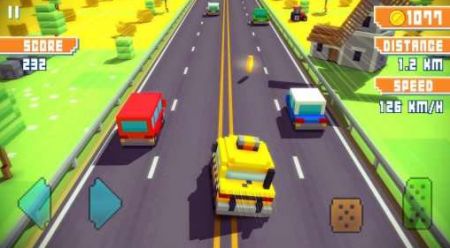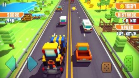 2、用戶駕駛著一輛方塊汽車,在道路上高速行駛。道路上不僅有其他競爭對手的汽車,還有火車從兩側駛來。在遊戲裏玩家需要靈活控制方塊汽車的轉向,避免與其他車輛相撞,同時要注意躲避火車的軌道,避免發生事故;