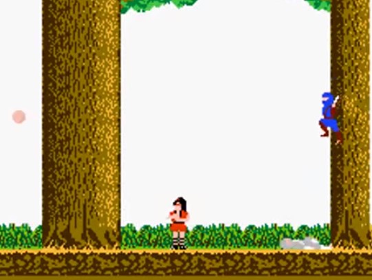 公主Kiri就被邪惡忍者綁架,這時,主角影從一片樹林後跳了出來,前去營救公主。遊戲總共只有兩個功能鍵——一個用來投擲忍者镖,一個是短刀攻擊,跳躍則對應的是方向鍵↑。我們的忍者英雄擁有難以置信的跳躍能力,可以輕易飛躍幾個屏幕的高度。如果說忍者镖是遠距離攻擊利器,那麽短刀就是近戰之王。