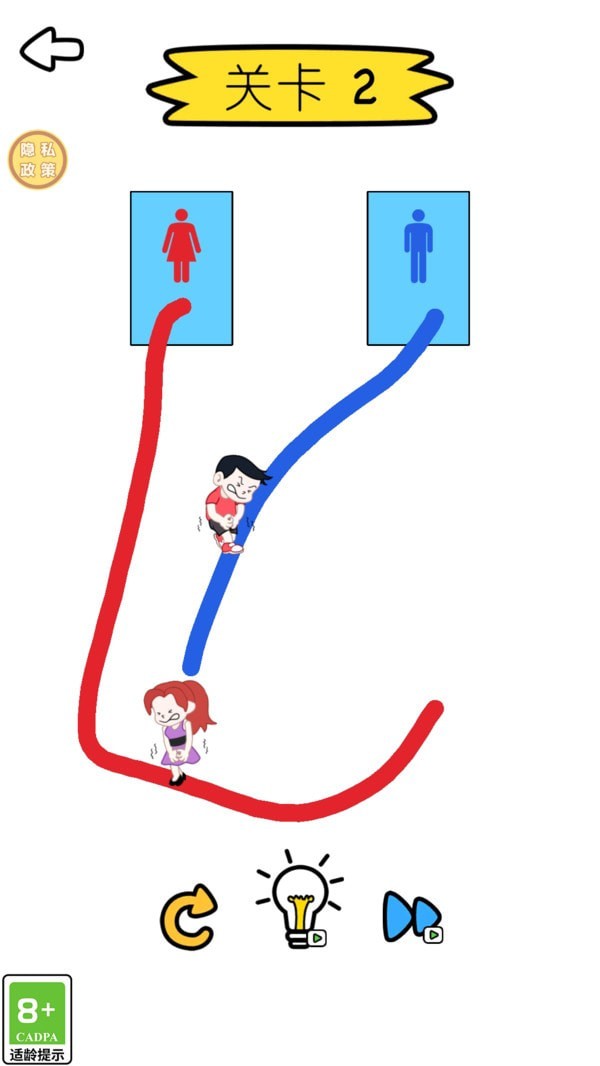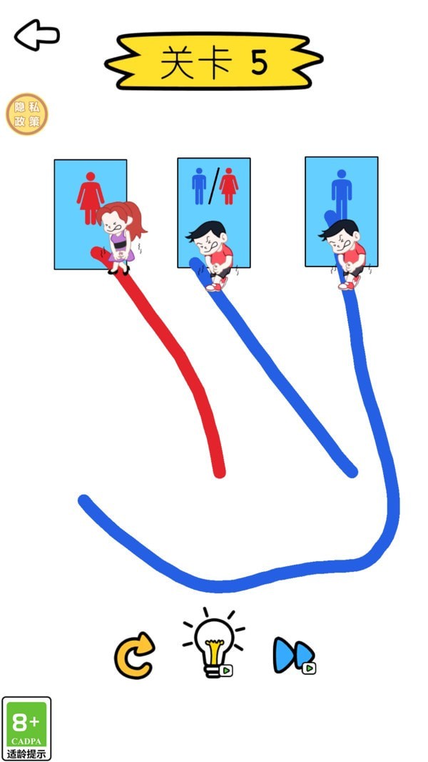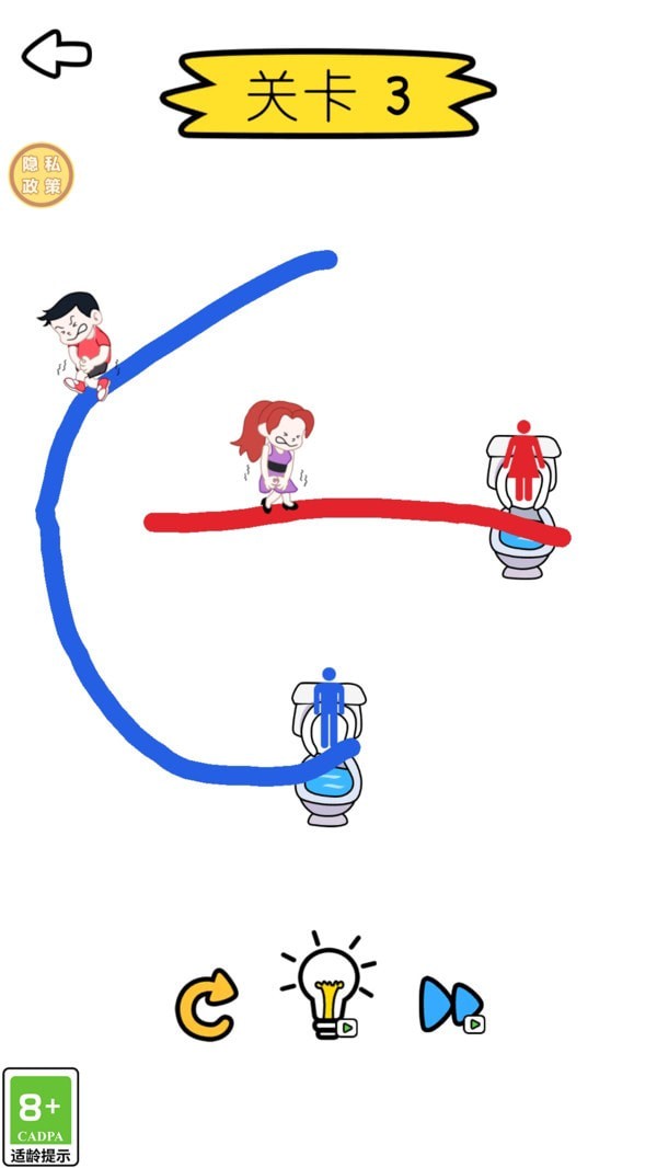 4、用戶需要在不同的關卡中,畫出一條安全的道路,讓主人公能夠在避開障礙物的同時順利到達廁所;
