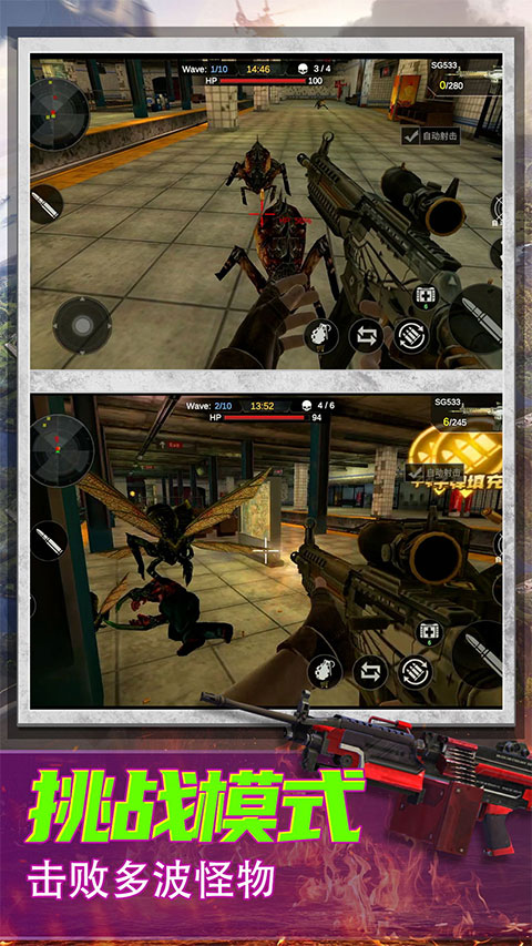 4、挑戰模式:這個模式是一個獨特的遊戲模式,擺脫了固定的對抗人類的遊戲方式,創新爲人類對抗怪物入侵的玩法,以此來保衛城市安全。在遊戲裏玩家攜帶槍械進入遊戲地圖,隨後城市將會被怪物入侵,在遊戲裏玩家需要做的就是存活下來並阻擋怪物的入侵,抵抗住一波又一波的怪物,越到後面,怪物越難擊殺,但是地圖內會隨機出現補給箱,爲遊戲玩家提供更加強大的武器和血量恢複。堅持到最後即可挑戰成功。