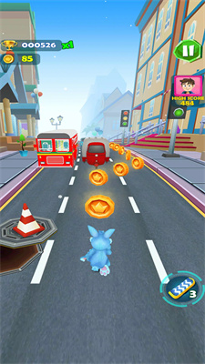 1、遊戲以跑酷爲主題,玩家需要控制藍兔角色奔跑。通過操作屏幕來控制角色的移動,躲避障礙物並收集遊戲內的道具。