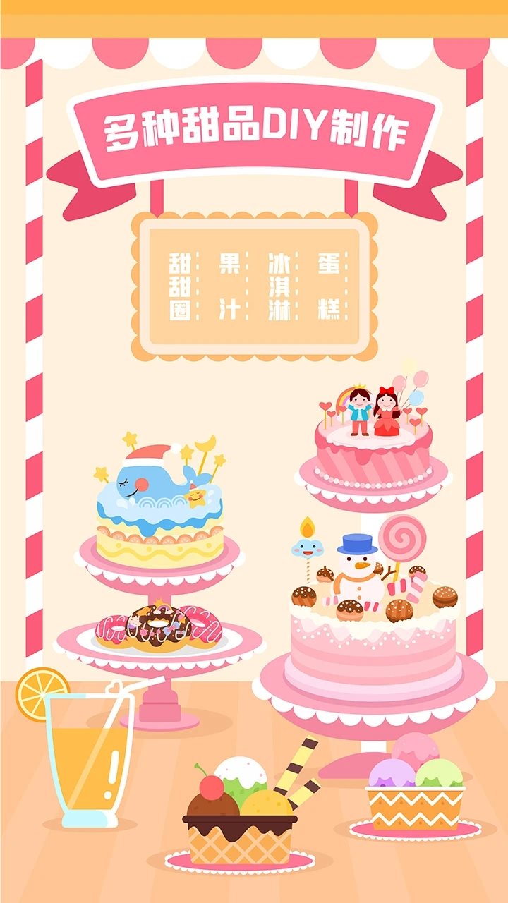 【豐富場景】精美的畫面設計,生動的動畫場景,精致又美味的甜品設計,每一位萌寶都可以制作不同樣子的甜品哦~