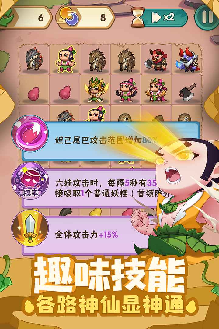 葫蘆娃大作戰作爲一款獨特而刺激的遊戲,使玩家沉浸在葫蘆娃的世界中。遊戲以塔防和消除爲基礎,結合了葫蘆娃的元素,爲遊戲玩家帶來了非凡的遊戲體驗。在遊戲裏玩家可以選擇不同的葫蘆娃角色,每個角色都有獨特的技能和能力。在遊戲裏用戶需要合理地安排葫蘆娃們的位置,以防止敵人的入侵。同時,在遊戲裏玩家還可以利用消除的機會來攻擊敵人,消除特定數量的方塊將觸發強大的技能。遊戲具有獨特而精美的畫面,以及令人愉悅的音效。