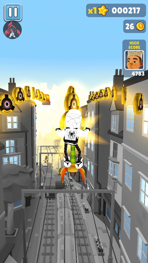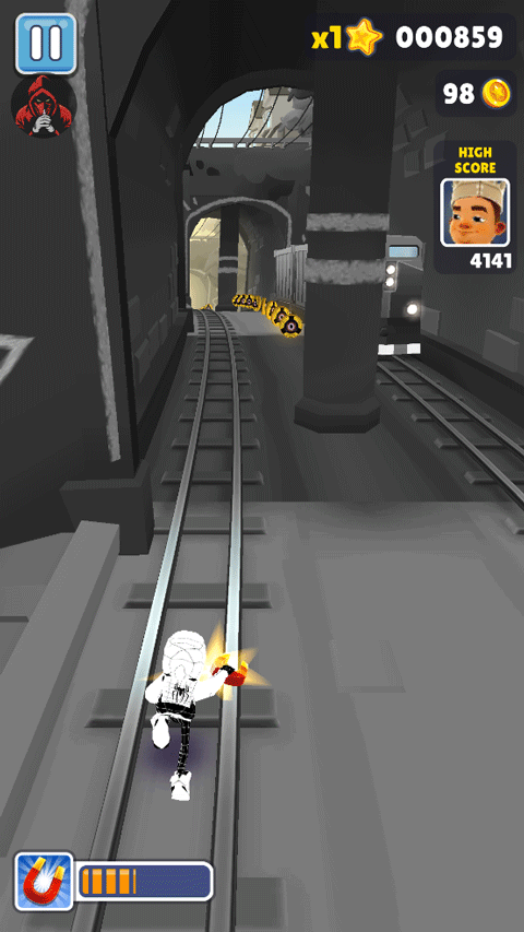 2、玩家需要在地鐵隧道中跳躍、滑行和閃避障礙物,收集金幣達成目標。
