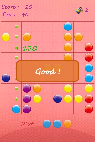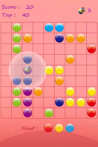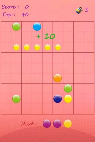 4、當縱向、橫向或斜向的同色球連成五個以上,這些球將自動消除並獲得分數;