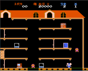經典 FC 遊戲,由日本南夢宮于 1983 年發行的橫版平台遊戲,玩家扮演著一只叫做 Mappy 小警察的老鼠,取得物品,並躲過貓咪們的攻擊,即可過關。