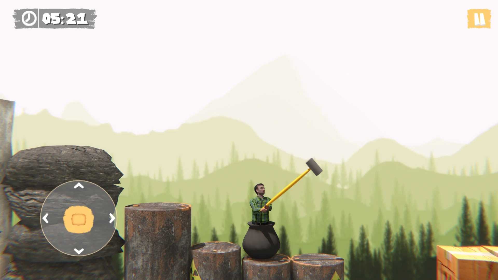 遊戲角色控制著一個罐子,用錘子爬上山頂,利用物理原理甩動身體,